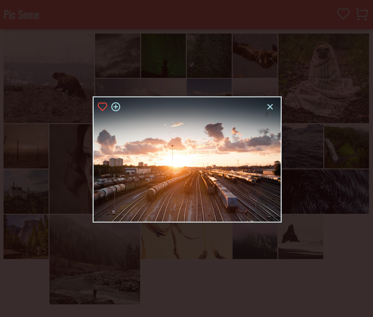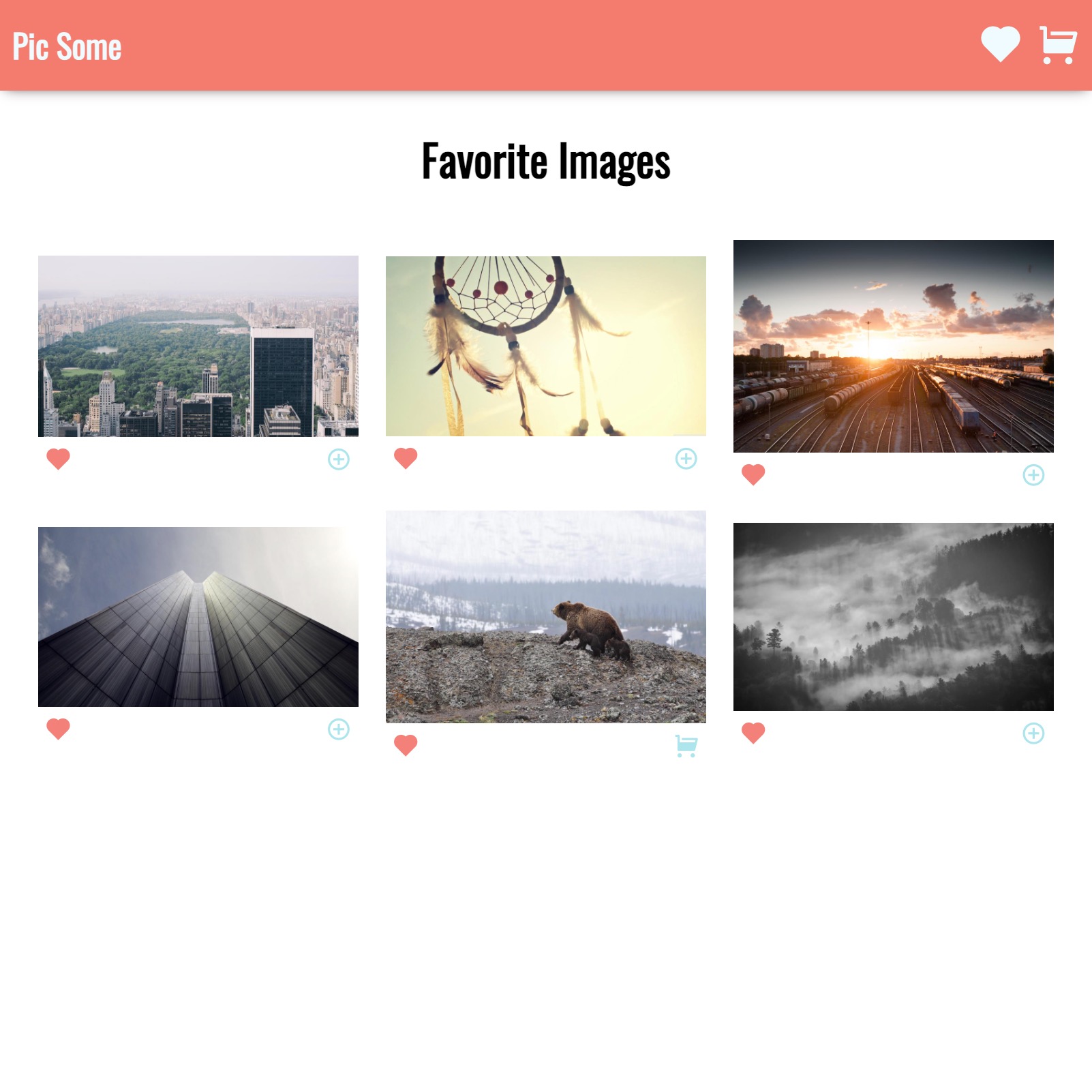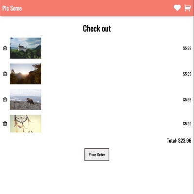 Pic Some is an online photo store created with React. It allows the user to like or select a photo for purchase, and photos are added or removed from a virtual shopping cart. Purchasing the photos is simulated on the Check Out page.